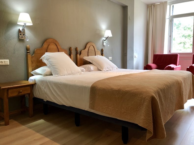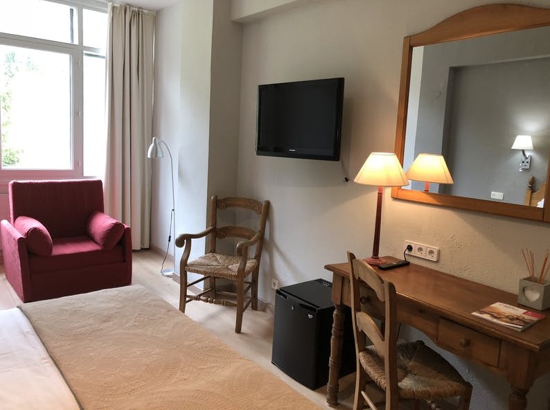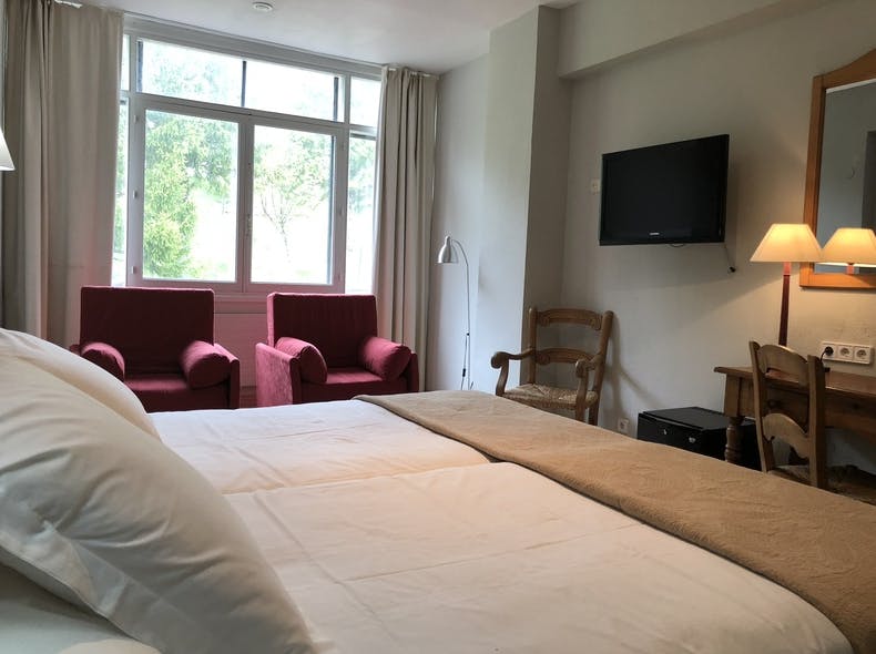 Cette chambre familiale dispose de 2 grands lits simples, d'un canapé-lit, d'une connexion Wi-Fi gratuite, d'une télévision à écran plat et d'une salle de bains privative avec baignoire, articles de toilette gratuits et sèche-cheveux. La grande fenêtre donne sur une petite pinède située à l'arrière de l'hôtel