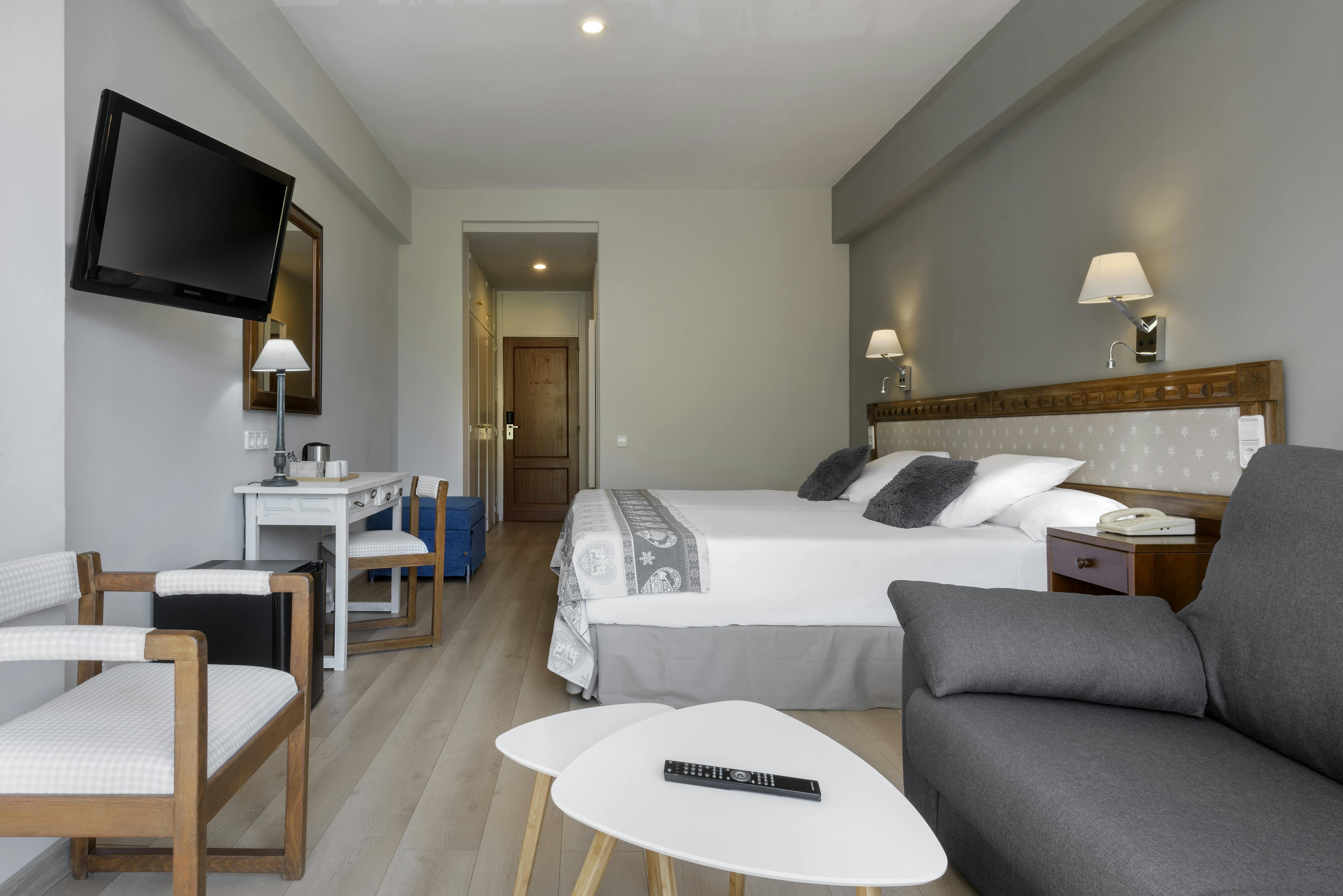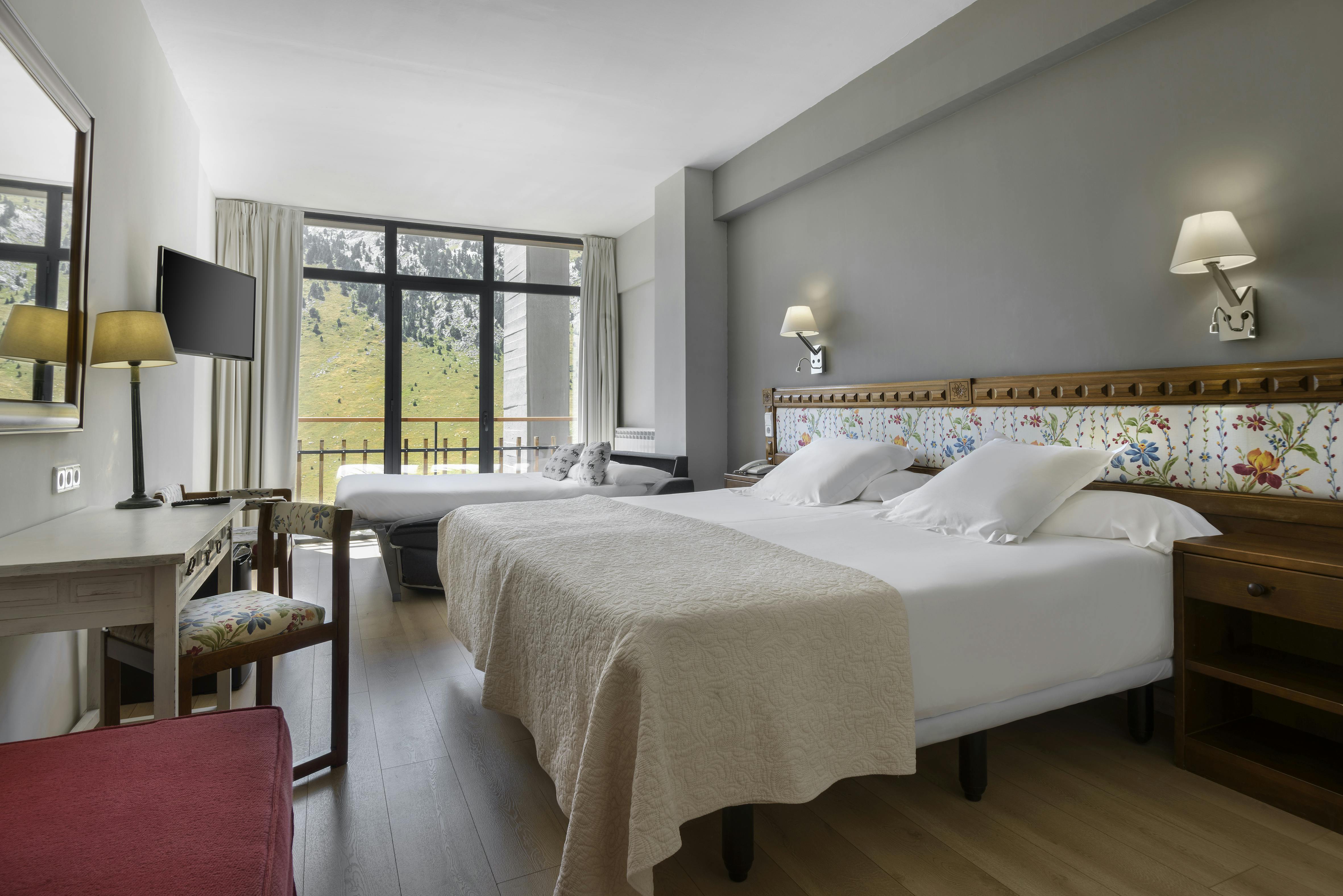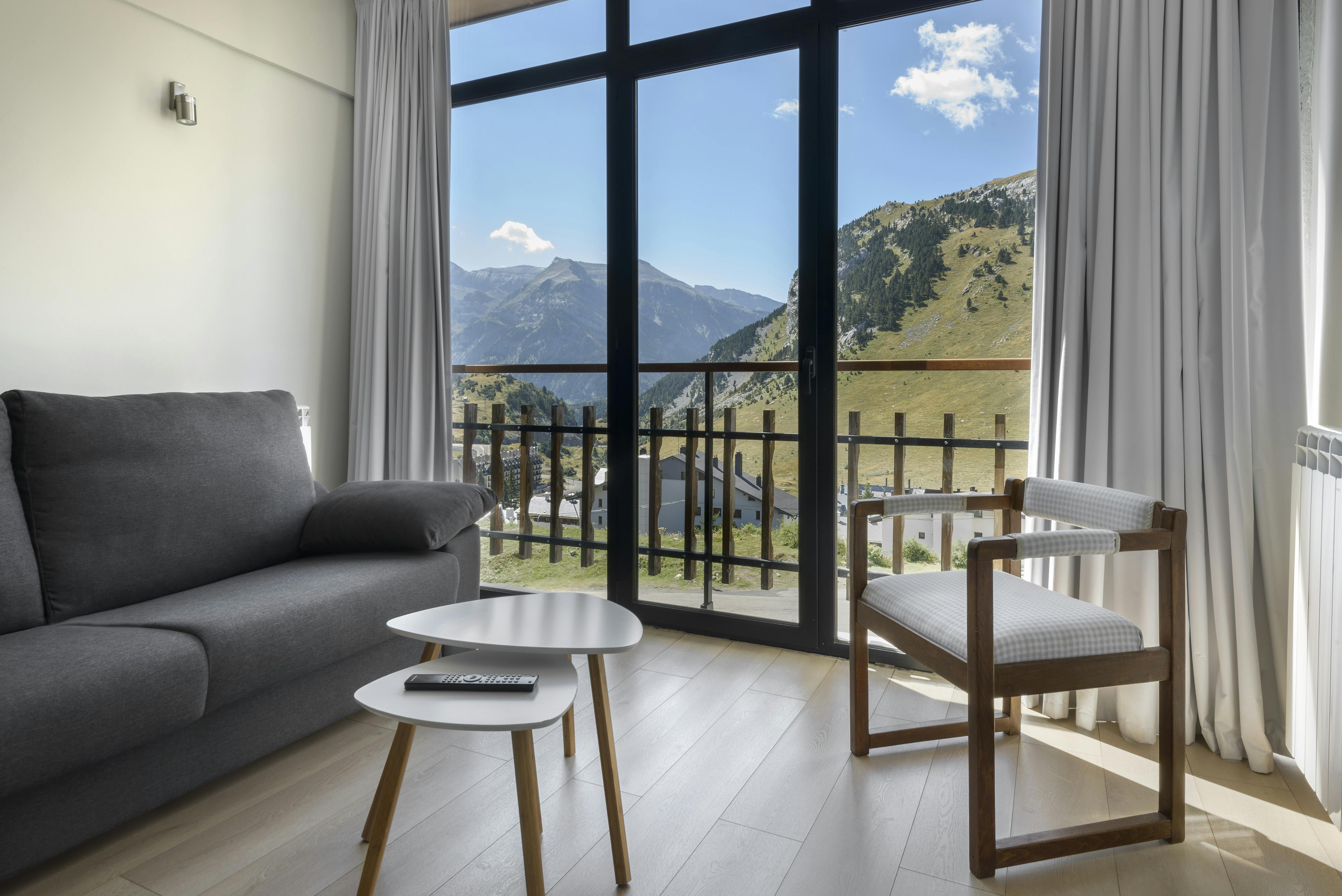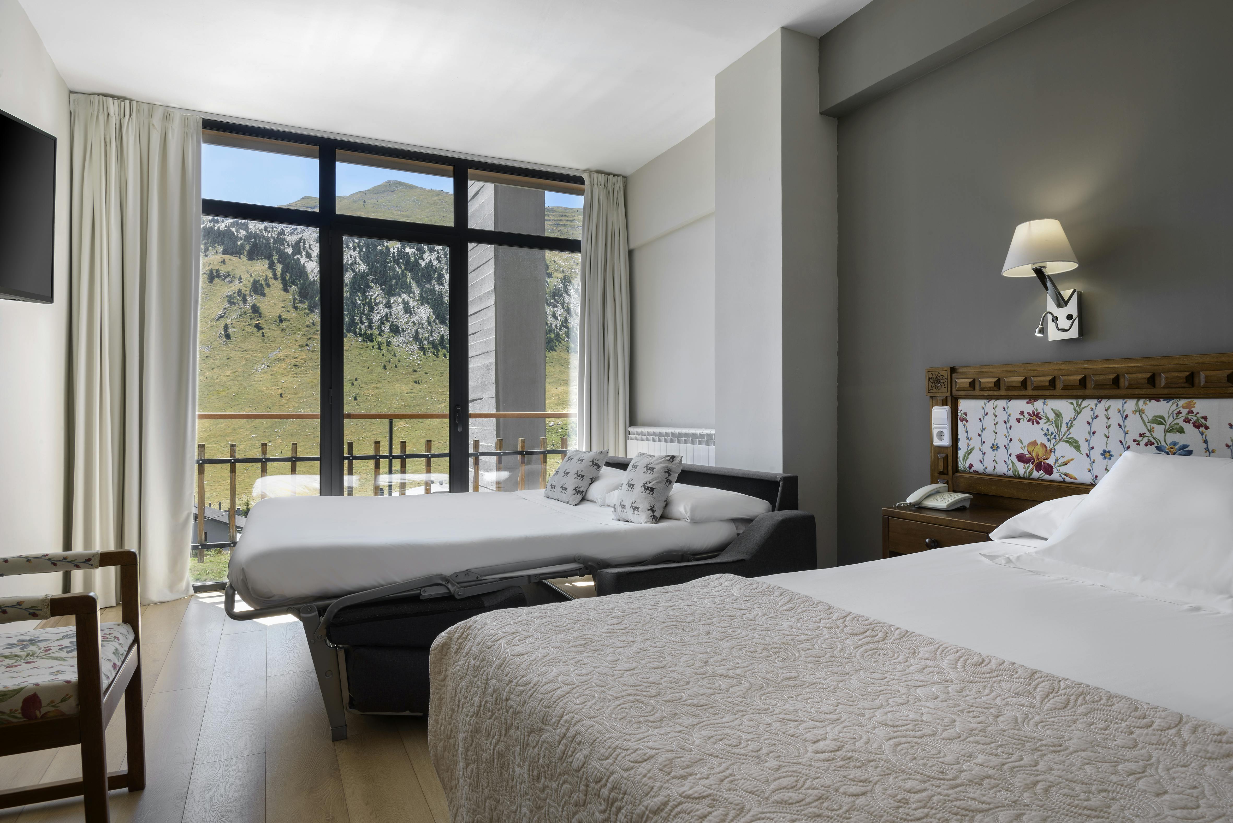 Enjoy the snow and the mountain in this spacious room with spectacular panoramic views of the mountains. It has two comfortable queen-size beds of 105x200 and a queen sized canape-lit., Large panoramic window. Ideal for a family of 4 (2 adults and 2 kids)